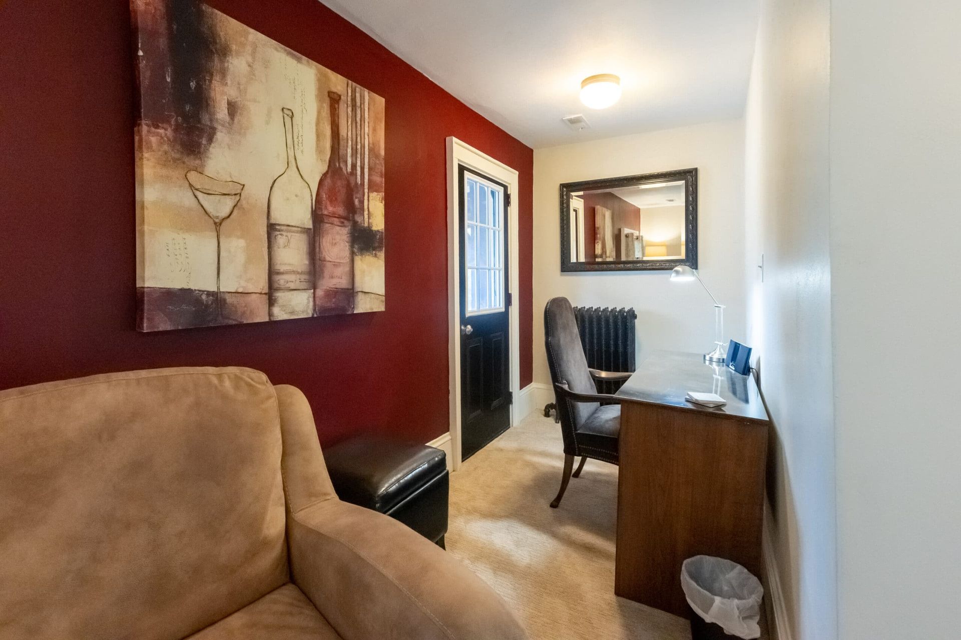 The majestic master bedroom is decorated in mossy green suede walls and plush drapes, soft crème Berber carpeting, and boasts a beautiful king size four poster bed. The living room has a small workstation, black sofa with a chaise lounge, and comfy accent chair.