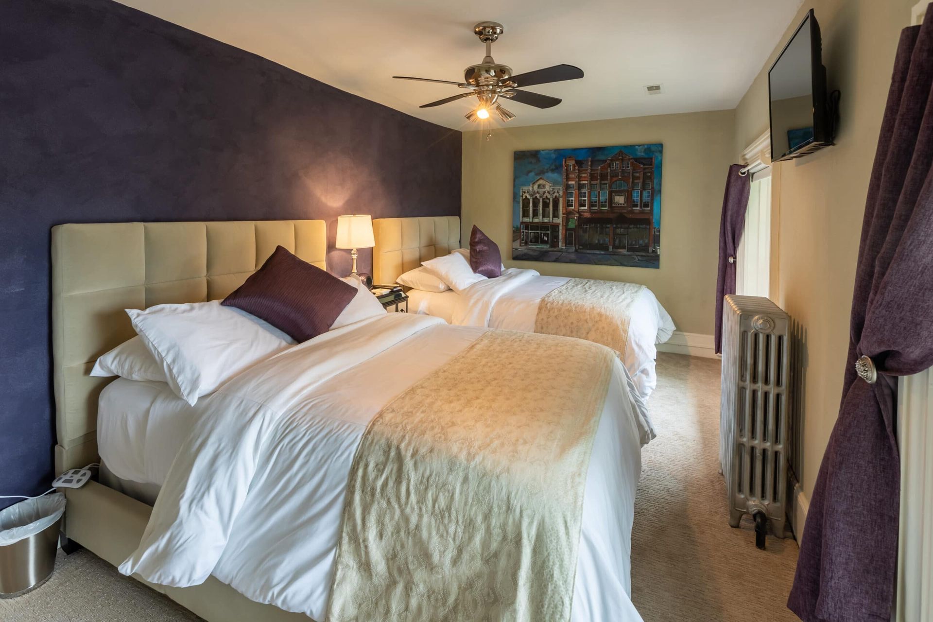 The second bedroom, located off the living room, offers two full size, extra-long, tufted beds that rest against dark-plum, granite painted walls. Plush bathrobes and ample closet space allow guests to feel relaxed and comfortable.